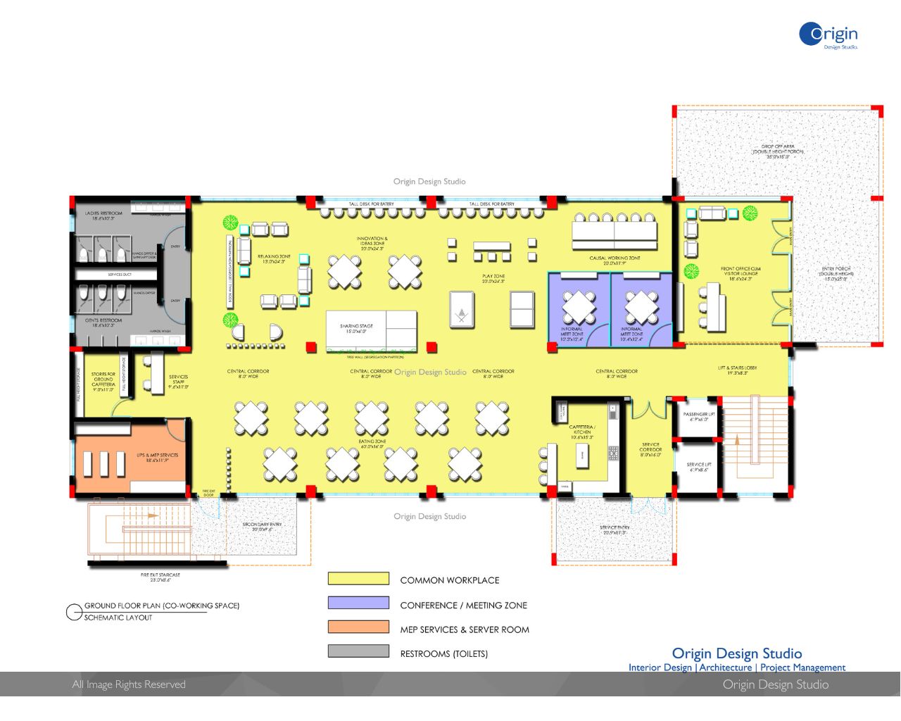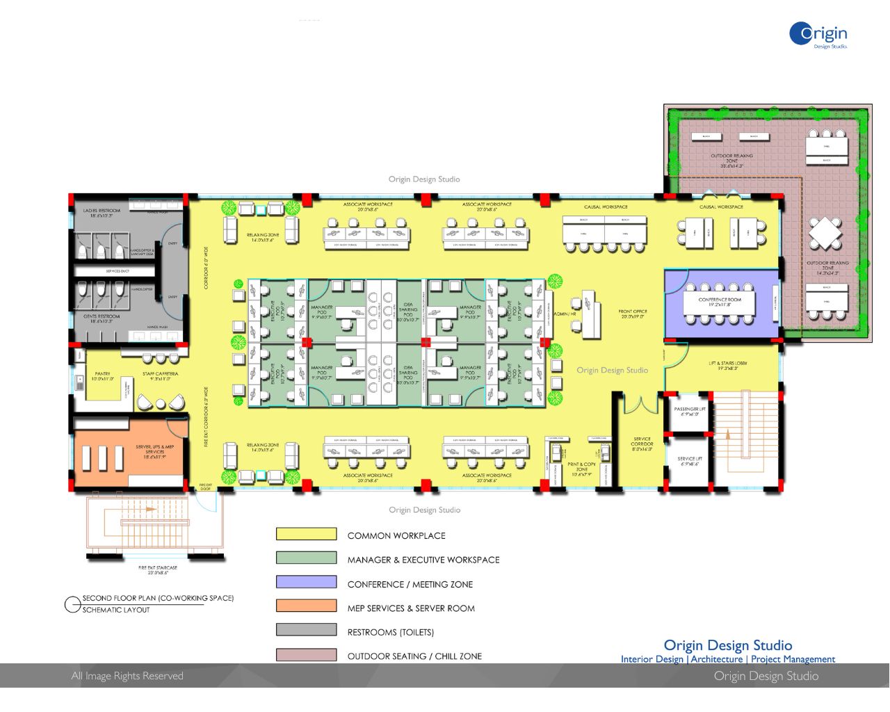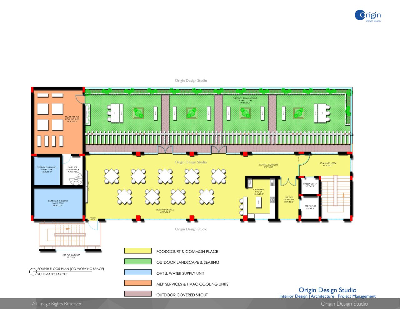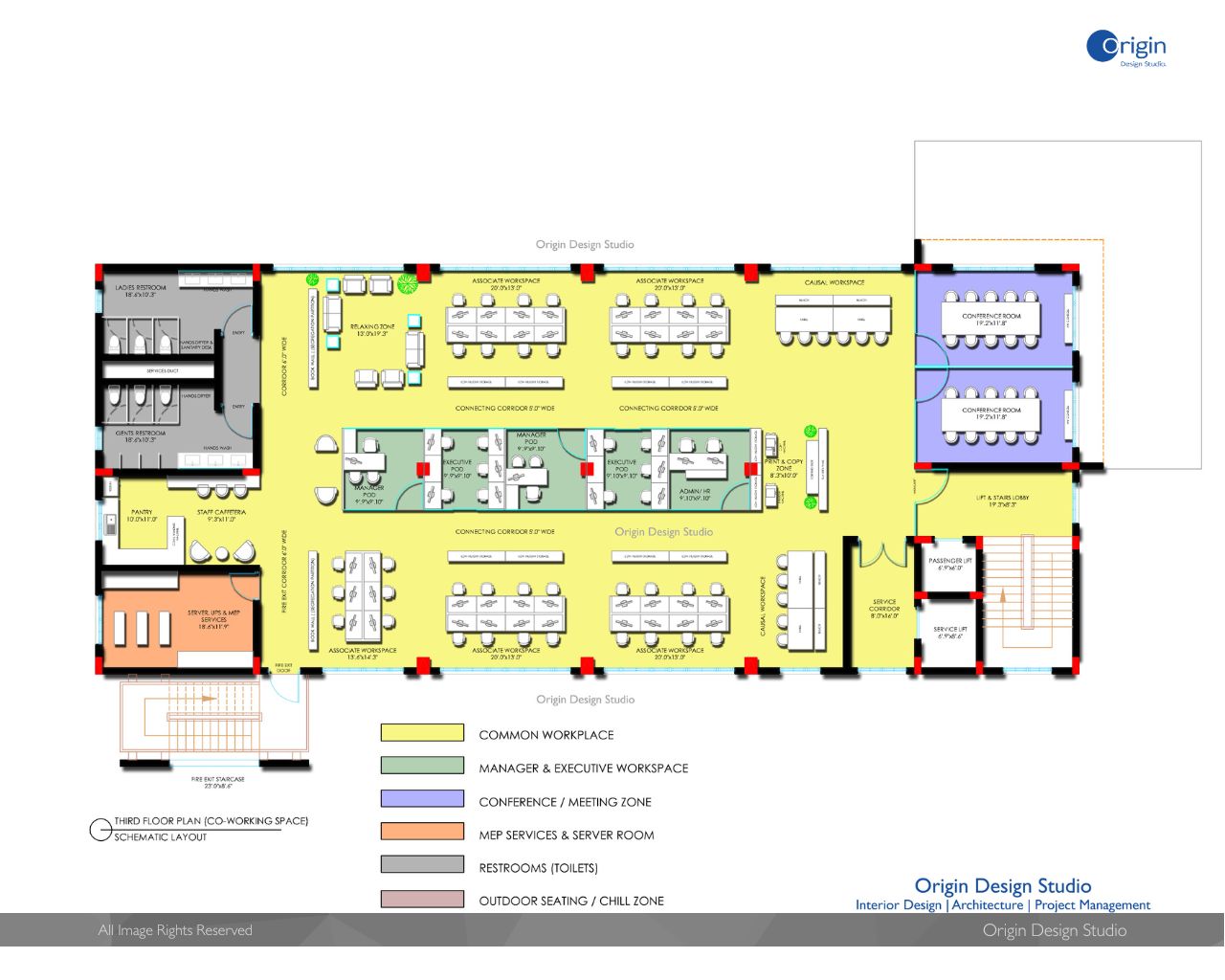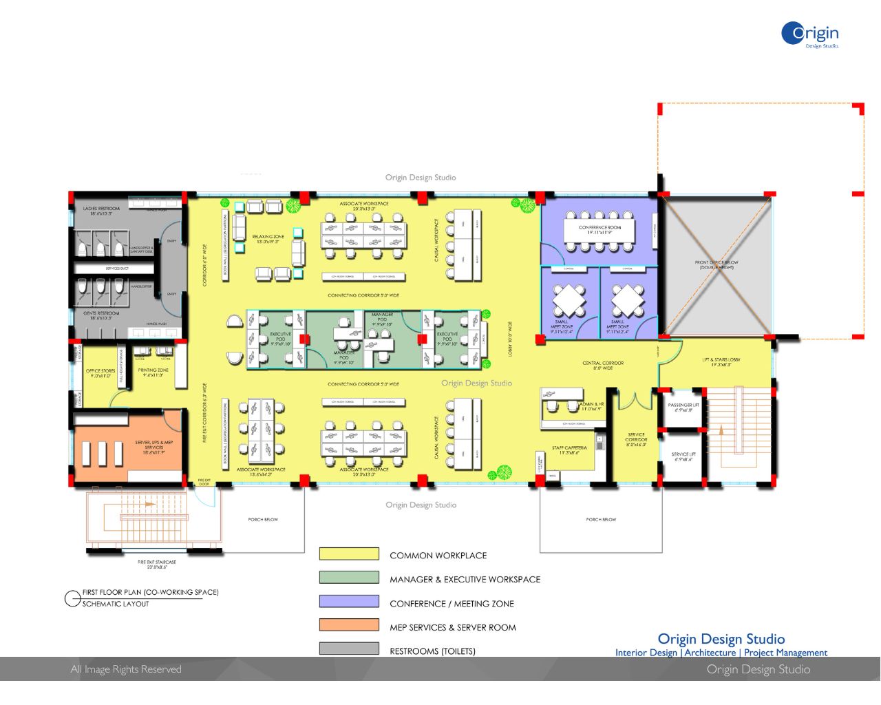 The Co-working Office Building designed for Multi-use Office spaces with 20,000.00 Sft spreading across 5 Floors. Designed as Agile floor space keeping in view of flexible interior design for Workstations, cabins and meeting rooms. The Open space floor planning serves adaptable and can be reconfigurable according to end users requirements. The Office Building has modern and Technological amenities serving all office floors.