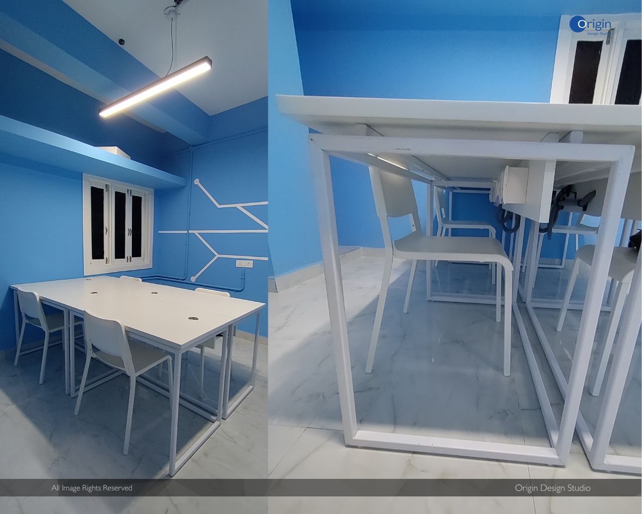 Project Features: Custom Powder Coated MS Metal Frame Workstations, Ply Laminated worktops, IKEA Chairs, Storage Unit, Custom Rack for Networking and Communications.